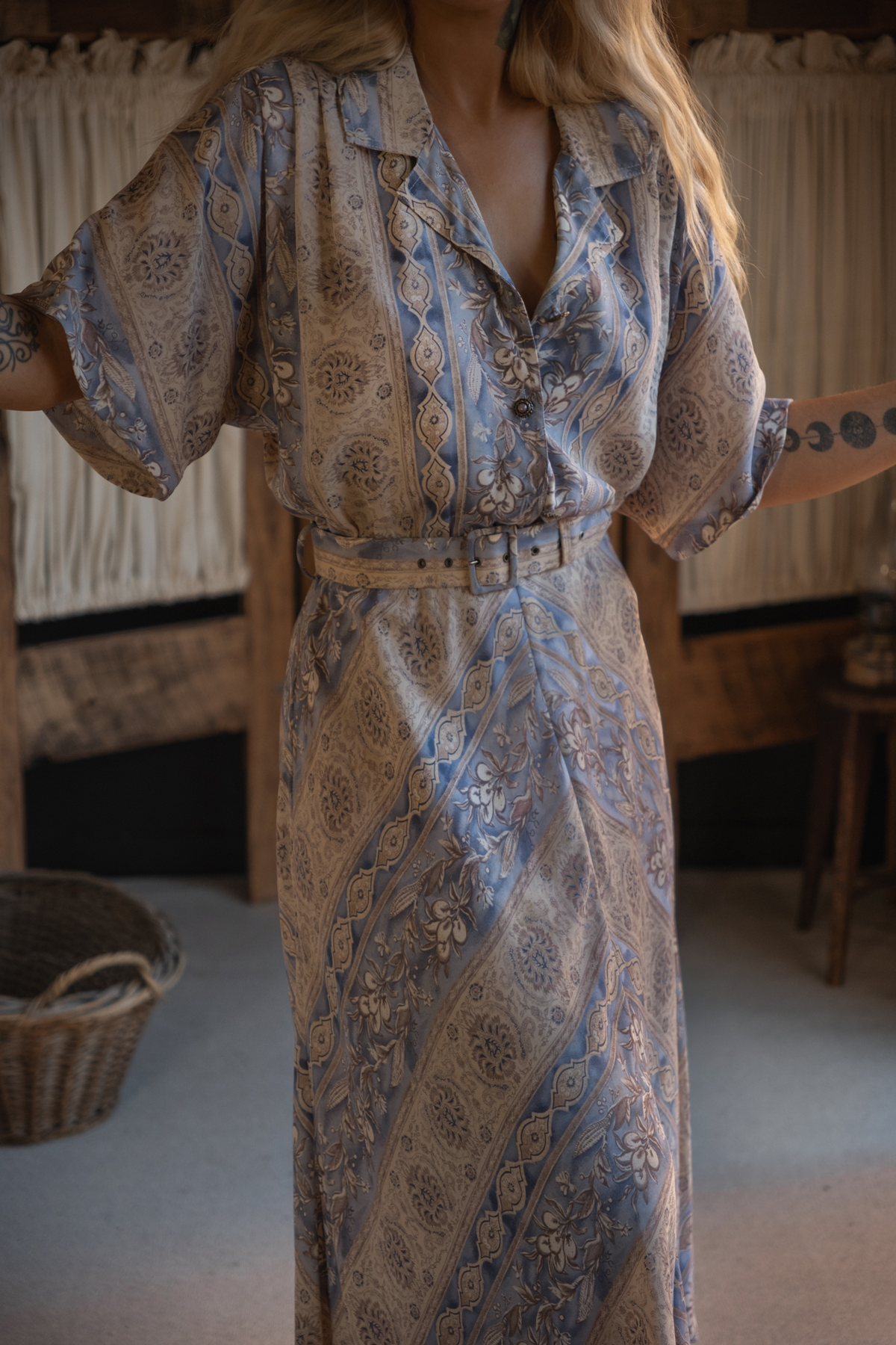 • Dimension: Shoulders 43cm, Bust 46cm, Waist 34cm, Seat 45cm, Arm 25 (w), Length 127cm